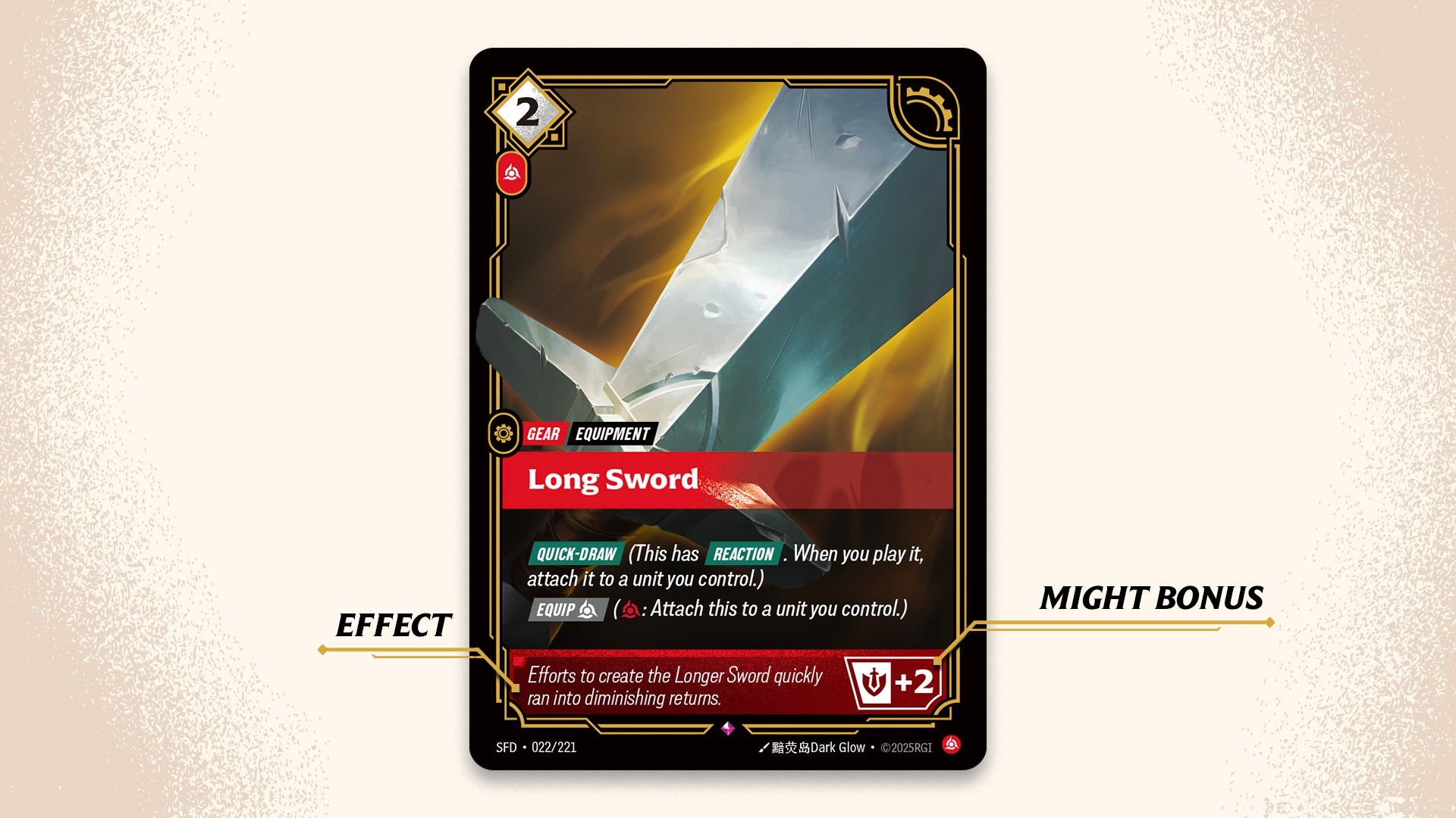 Certains Équipements possèdent un nouveau mot-clé en plus d'Équiper. Le nouveau mot-clé Dégainage Rapide vous permet de jouer (et par conséquent d'attacher) un Équipement directement depuis votre main à la vitesse Réaction. C'est parce que les cartes avec Dégainage Rapide ont intrinsèquement Réaction comme partie imbriquée de Dégainage Rapide. En plus d'accorder Réaction, ce mot-clé est aussi un Effet de Mise en Jeu (Play Effect) qui attache l'Équipement joué directement à une unité que vous contrôlez — pas besoin de payer le coût d'Équiper. Pour cette fois. Dégainage Rapide ne change cependant pas le moment où vous pouvez utiliser la capacité Équiper d'un Équipement, seulement quand vous pouvez le jouer depuis votre main.